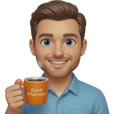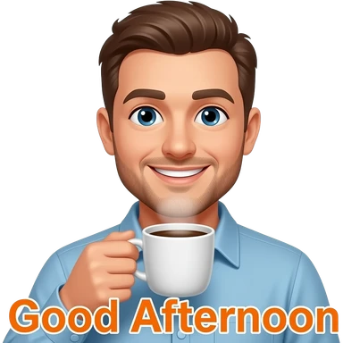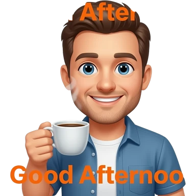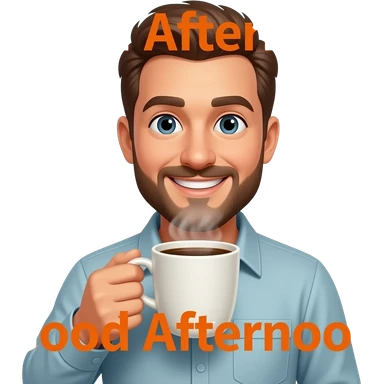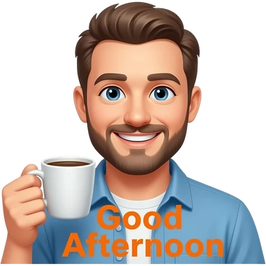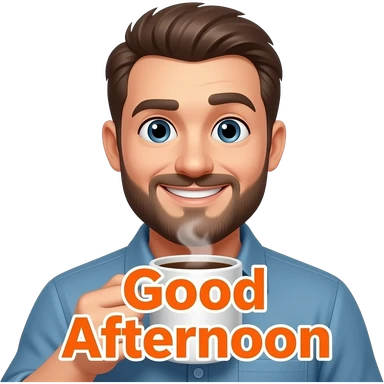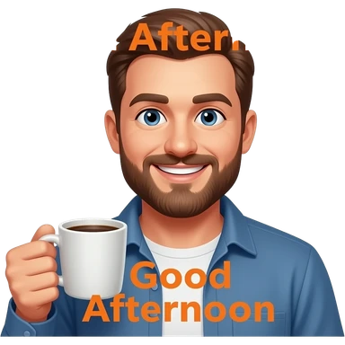 a stubbled face man smiling lifting a steaming cup of coffee close to the camera with the words 'Good Afternoon' in orange printed across emoji
