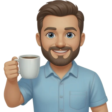 a stubbled face man smiling lifting a steaming cup of coffee in front of the camera smiling emoji