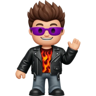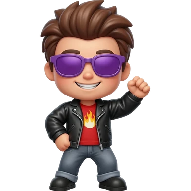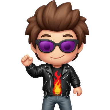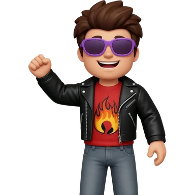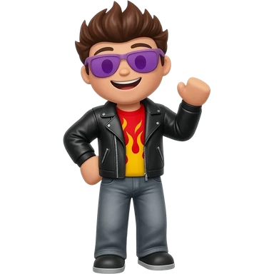 Cool Roblox boy avatar emoji, brown hair, purple sunglasses, smiling face, black leather jacket, red shirt with flame design, gray jeans, confident pose with one hand raised, playful and stylish vibe, 3D cartoon style, bright lighting, cute gaming emoji style emoji
