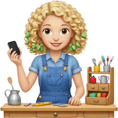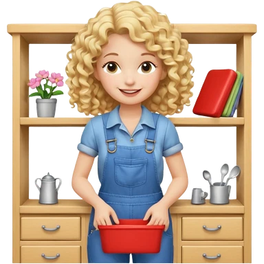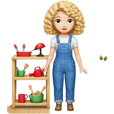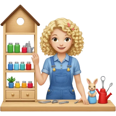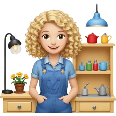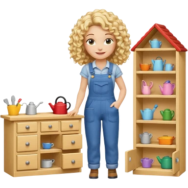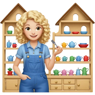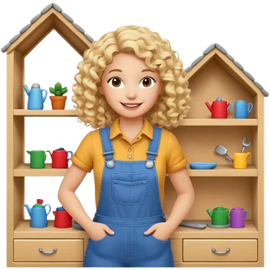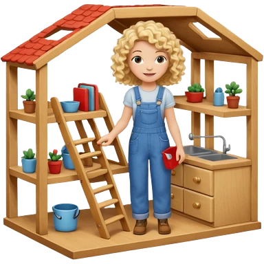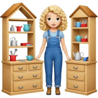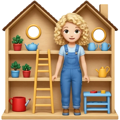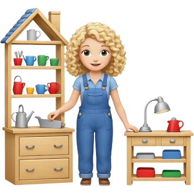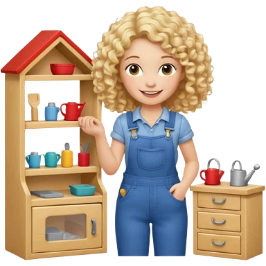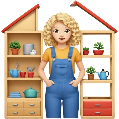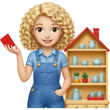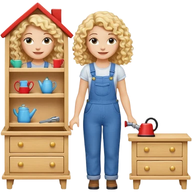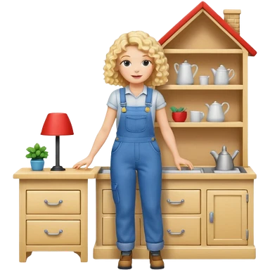 blonde curly woman arranging furniture in doll house with overalls emoji
