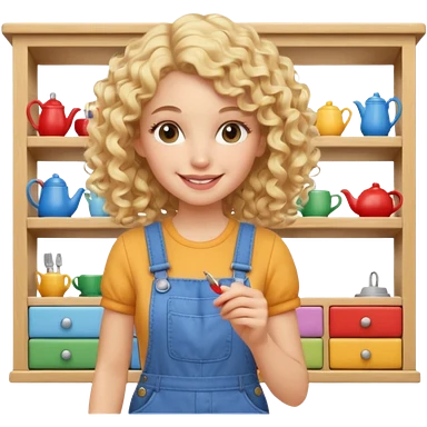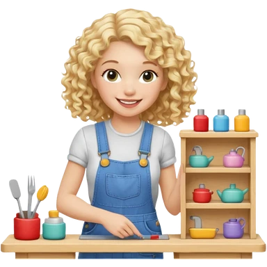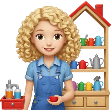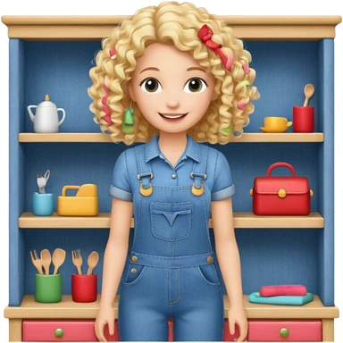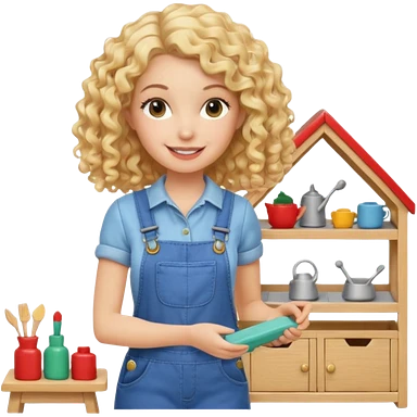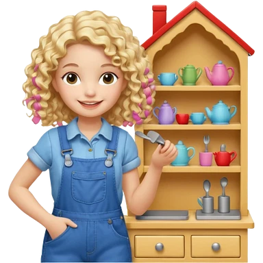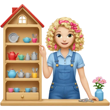 smiling blonde curly girl arranging furniture in doll house with overalls emoji