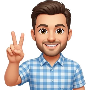 person smiling holding up a peace sign with fingers touching face by eye emoji