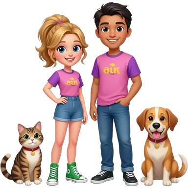 White girl with blonde brunette hair tied up wearing a pink and purple shirt and green converse hi tops with her Asian boyfriend with brown skin colour who is the same height as her, smiling with her cat and dog emoji