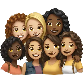 six diverse girl friends, different hair and skin tones as described, smiling and standing together emoji