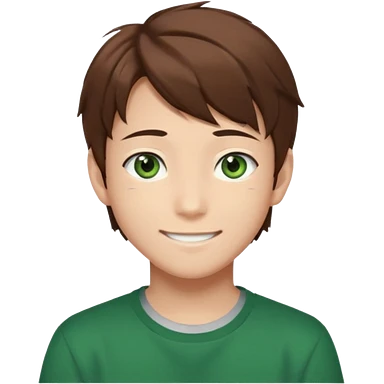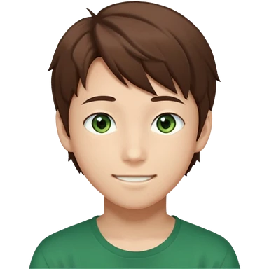 the face of an Anime teen boy with brown hair, green eyes, looking smiling slightly sideways positioned. Face must be main filling of the emoji. 128px emoji