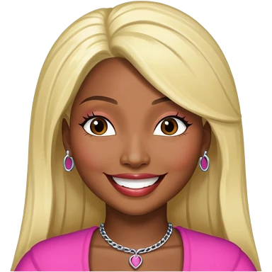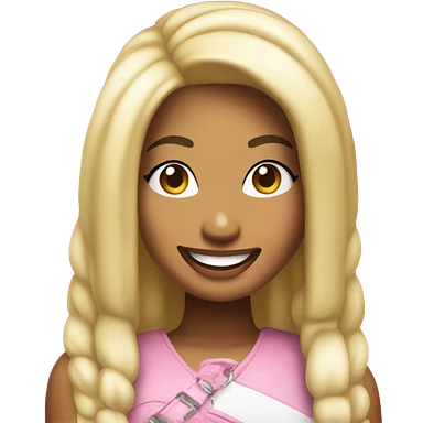 Smiling Green eyed light white skin, no freckles, Nicki Minaj wearing a pink leopard print outfit no freckles, and light pink lips emoji | AI Emoji Generator