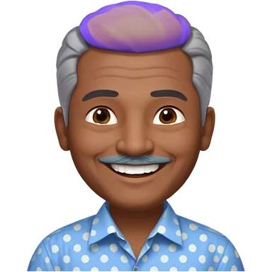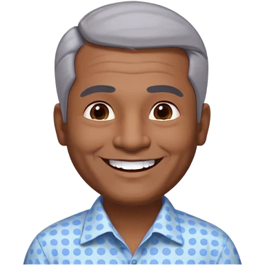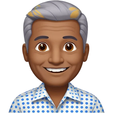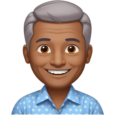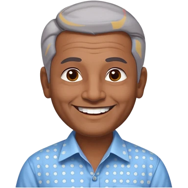 50 yr old indian man, dark skin, grey hair, big smile, white teeth, chubby, no moustache, clean shaven, young style hair, hair brushed back, 5 oclock shadow, bindy dot on forehead, dress shirt emoji