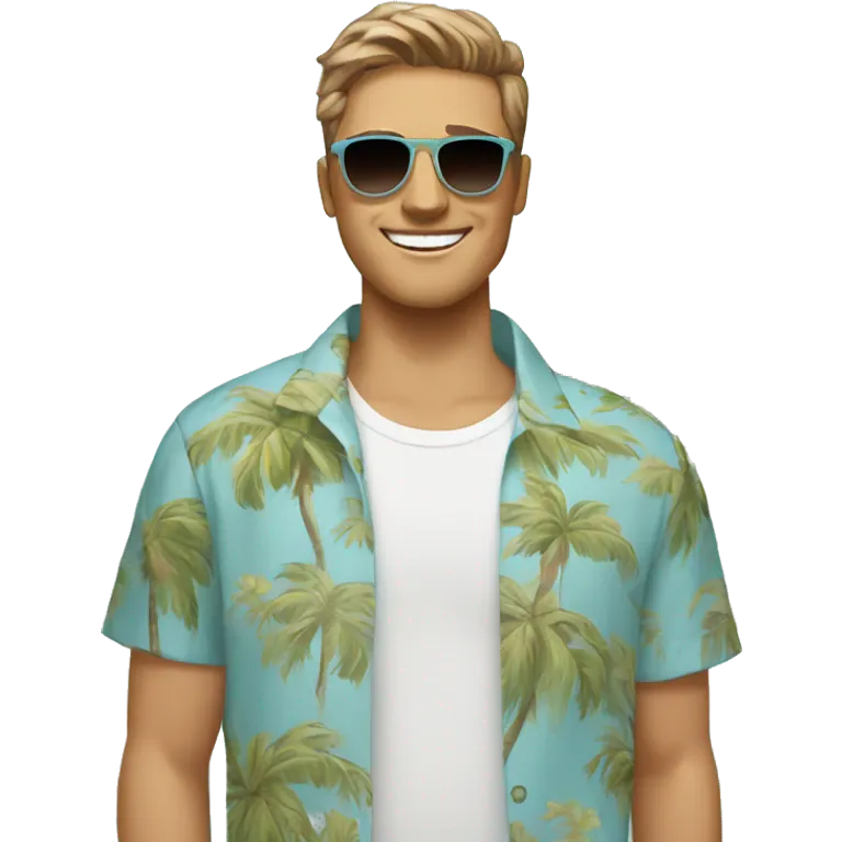 Smiling man, lightly tan white skin, black eyebrows, oblong face shape, light brown messy bowl haircut, wayfarer sunglasses, light blue hawaiian shirt with white palm tree patternemoji
