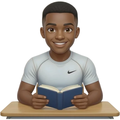 make a 20 year old man black skinned low taper fade in a white nike compression shirt sitting at a table of 4 at school and he is reading his book and looking uo at me smiling and his eyes are shining emoji