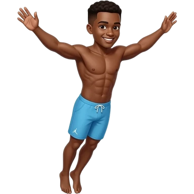 make a black skinned 20 year old man in a brown low taper fade with no shirt bunch of abs diving off the high diving board in light blue jordan swimtrunks not smiling emoji