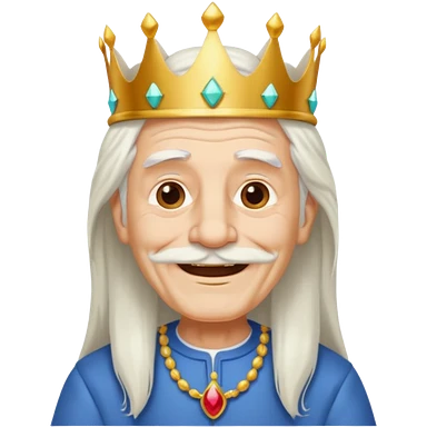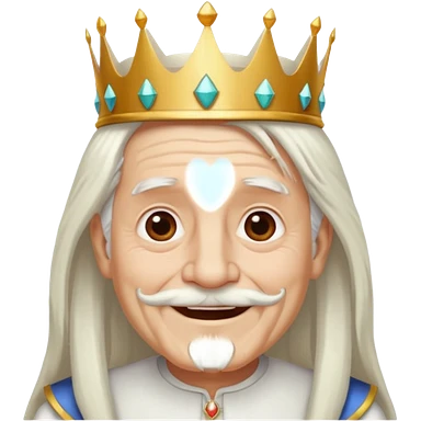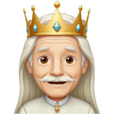 a smiling old man with long white hair and has no beard wearing a white smart shirt and a crown emoji