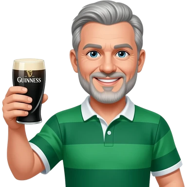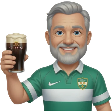 Smiling grey haired man with beard in an ireland rugby shirt raising a glass of Guinness emoji