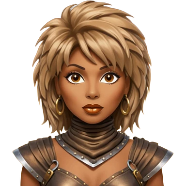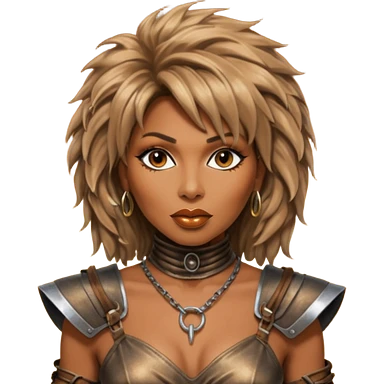 Solarpunk solar aesthetic shiny glowing divine lighting - portrait of Tina Turner in costume from the movie Mad Max Beyond Thunderdome, dramatic backlit by bronze spotlights emoji