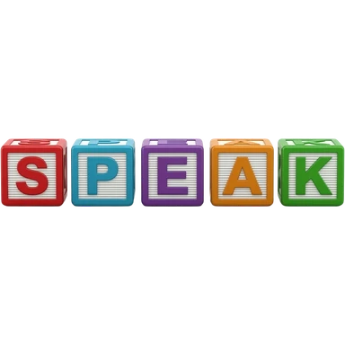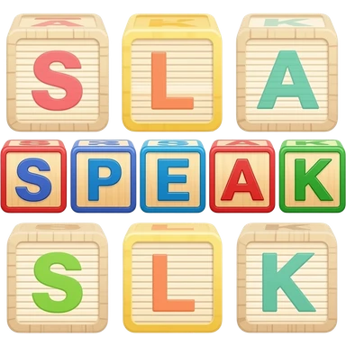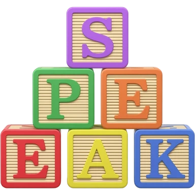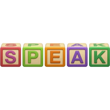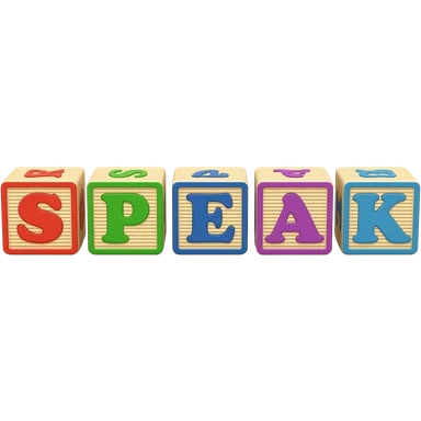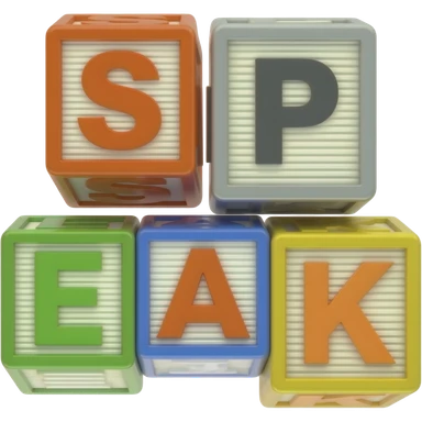 Five children's blocks forming the word "SPEAK", two blocks on top, three at the bottom emoji