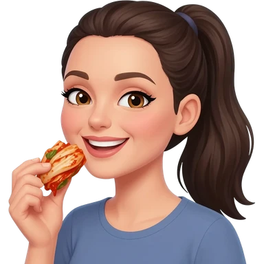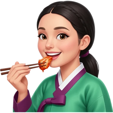 Hanbock brunette european woman smiling with eyeliner and black long hair ponytail eat kimchi emoji