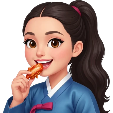 Hanbock brunette european eyes woman smiling with eyeliner and black long hair ponytail eat kimchi emoji