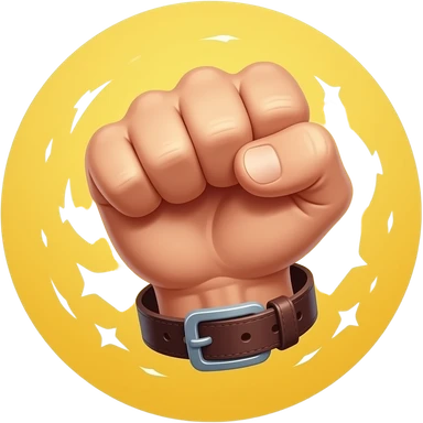 "A 3D rendered emoji of a furious muscular fist tightly gripping a dark brown leather belt, captured mid-air with stylized white speed lines and small energy sparks, indicating a powerful whipping action, cartoonish detail, plain yellow circular background." emoji