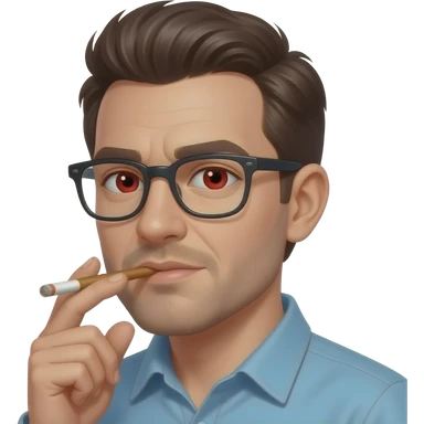 Chubby goofy looking middle aged white guy with dark brown, but graying hair and bloodshot eyes, Smoking A SUPER HUGE white and green smoking doobie emoji