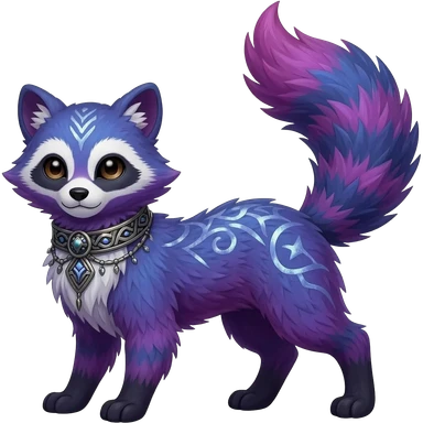 Rare colorful bluish purplish pinkish gradients furry fuzzy silvery exotic cute epic aesthetic gothic colorful Salandit-Eevee-Civet-species-Fakemon-hybrid-creature, with a collar, and with intricate tribal markings, full body emoji