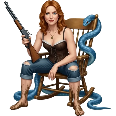 realistic cinematic Tori Amos sits on a rocking chair in a torn corset, holding an antique rifle and her bare feet are muddy. A blue snake is wrapped around the chair. emoji