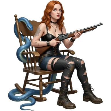 solarpunk ultra HD old and tired Tori Amos casually crouches on a rocking chair in a torn corset, holding a vintage lintlock double-barreled rifle and with muddy feet. a blue snake wrapped itself around the chair emoji
