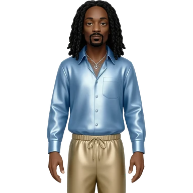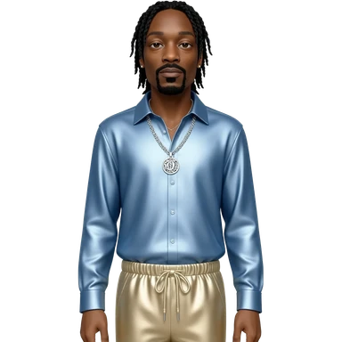 Snoop Dogg with long black hair, light blue metallic shirt, beige metallic harem pants, silver necklace emoji