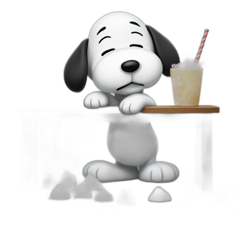 Snoopy (full body, standing) holding a straw in his hand against his nose bent over a table sucking up a pile of sugar emoji | AI Emoji Generator
