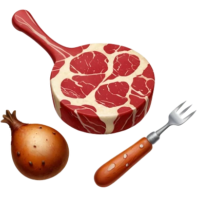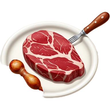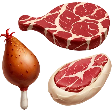 A raw red steak with visible marbling placed next to a small chicken drumstick. emoji