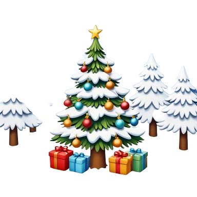 Snow covered pine Christmas tree with pink ornaments and snowflake star emoji