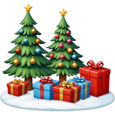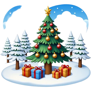 Snow covered pine Christmas tree with pink ornaments and snowflake star gold bows emoji
