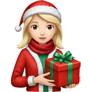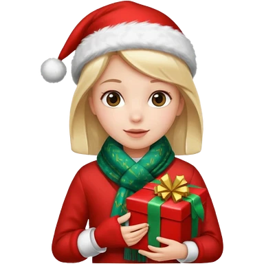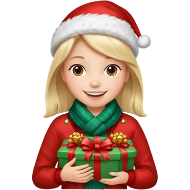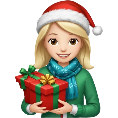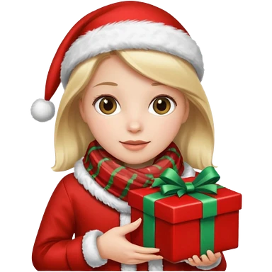 a girl wearing a chirstmas jacket and scarf and holding a christmas gift emoji