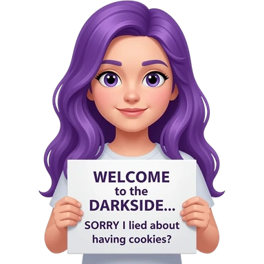 girl with long purple hair holding a WELCOME to the DARKSIDE... SORRY I lied about having cookies? sign emoji
