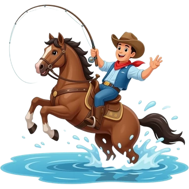 a cowboy falling off a horse into the water, with a fishing rod in his hand emoji