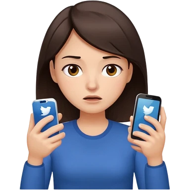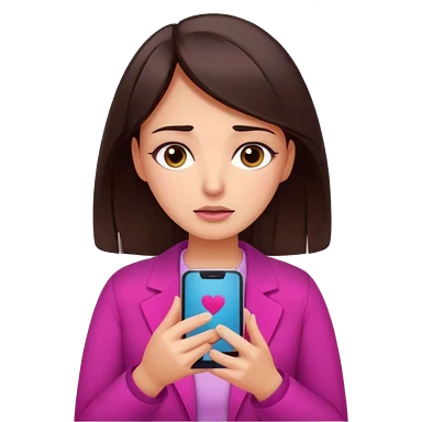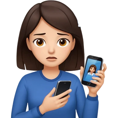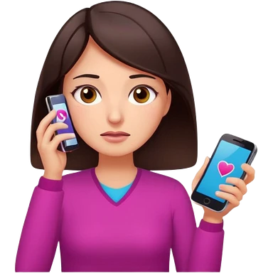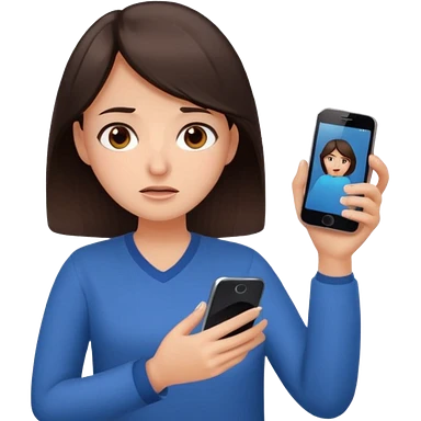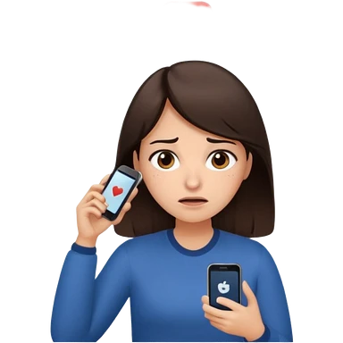 Social media manager. She has dark brown hair, brown eyes, overwhelmed expression, tired eyes, slightly stressed face,a holding a smartphone with notifications piling up emoji