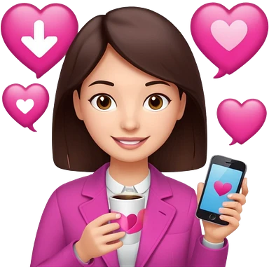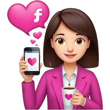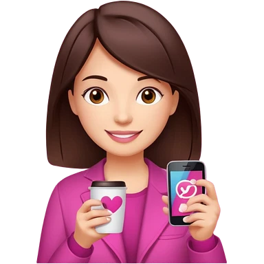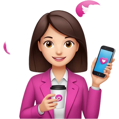 Social media manager. She has dark brown hair, brown eyes, a friendly smile. She is holding a smartphone and a coffee cup. Include subtle marketing elements like small icons of hashtags or a speech bubble with a heart, instagram logo. Use vibrant colors with a focus on pink and fuchsia tones. emoji