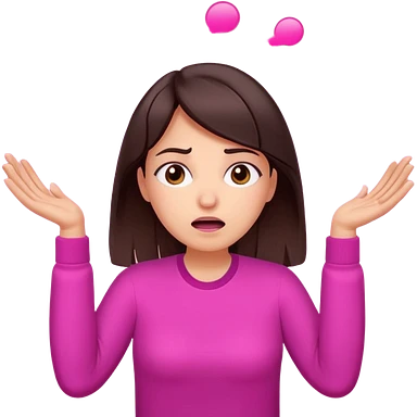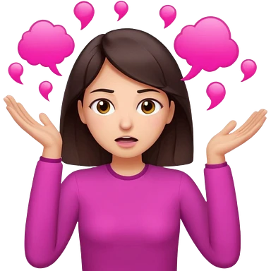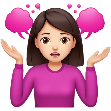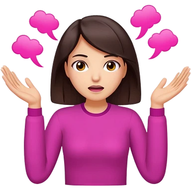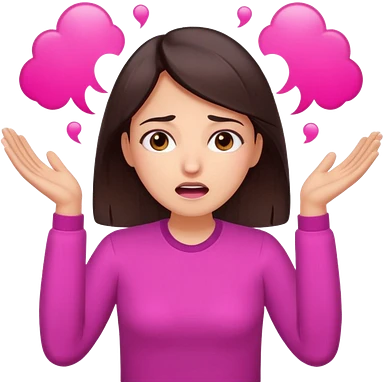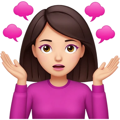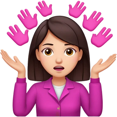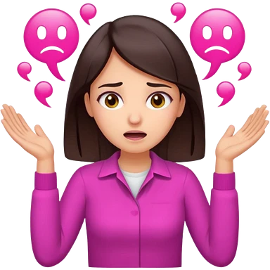 Social media manager. She has dark brown hair, brown eyes,stressed expression, exhaling deeply, hands slightly raised showing frustration. Use vibrant colors with a focus on pink and fuchsia tone emoji