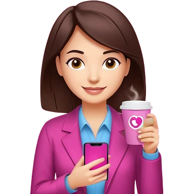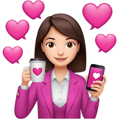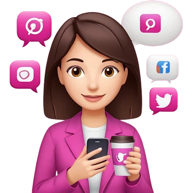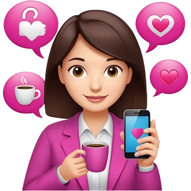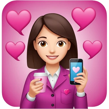 Social media manager. She has dark brown hair, brown eyes, a friendly smile. She is holding a smartphone and a coffee cup. Include subtle marketing elements like small icons of hashtags or a speech bubble with a heart. Use vibrant colors with a focus on pink and fuchsia tones. emoji