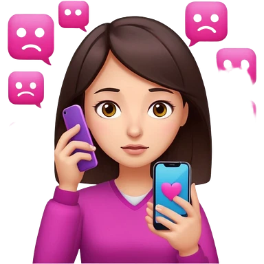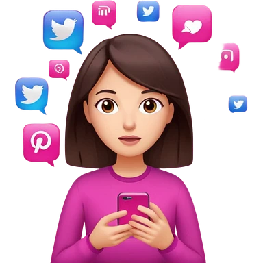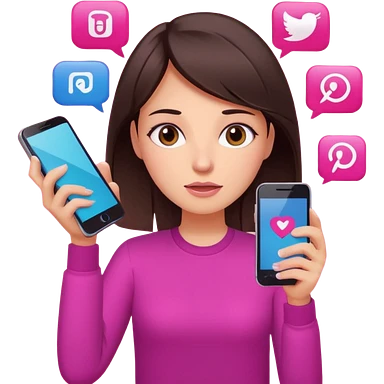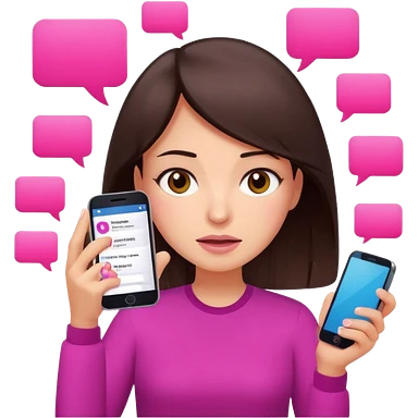Social media manager. She has dark brown hair, brown eyes, overwhelmed expression, slightly stressed face,a holding a smartphone with notifications piling up. Use vibrant colors with a focus on pink and fuchsia tone emoji