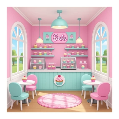 A sweet Barbie-style pastel cupcake café with out view emoji