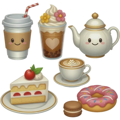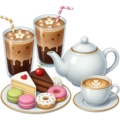 Main café items in a Barbie-inspired pastel style, including hot and iced coffee cups with cute straws or toppers, latte art designs like hearts and flowers, an elegant teapot and teacup set, and a dessert plate filled with cake slices, macarons, and donuts emoji