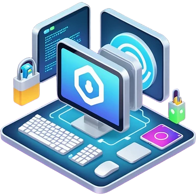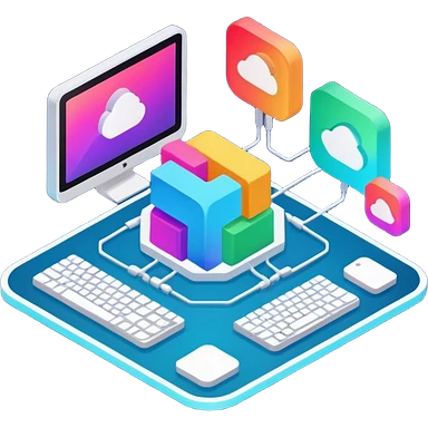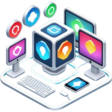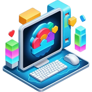 isometric, image of computer systems, processes, data integrating together emoji