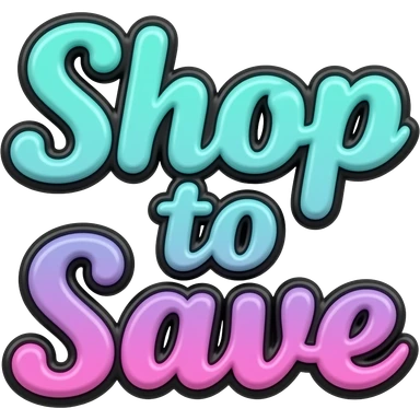 Exact words "Shop to Save" in ombre turquoise to fuchsia pink colored girly typography lettering with a thin black border around each letter, 3d render, high definition. Must have no emoji icons, no emoji faces emoji