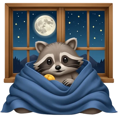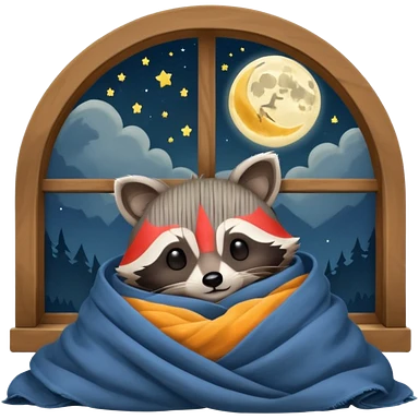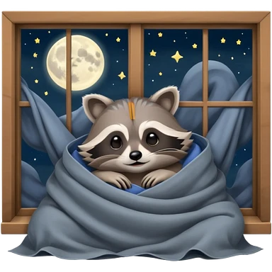 A raccoon sleeps under a blanket against the backdrop of an open window with the moon emoji