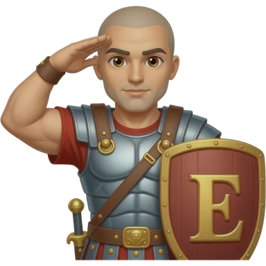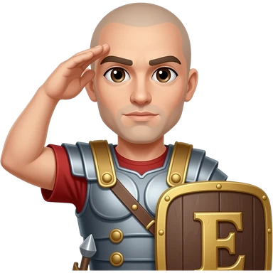 Athletic Roman soldier bald with brown eyes the Letter E on the shield saluting emoji