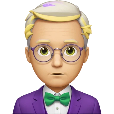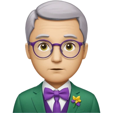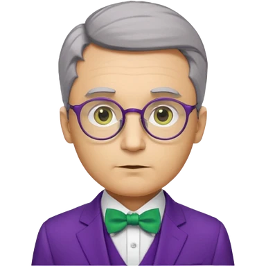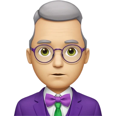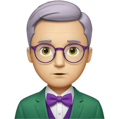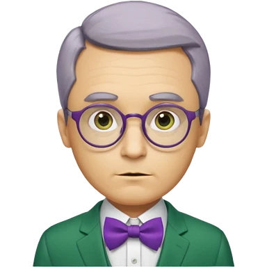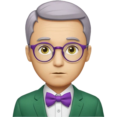 ellow-skinned man with neatly parted brown-gray hair, thick rectangular eyebrows, large round eyes behind thin glasses, a pointed nose, and a green suit with a white collar and purple bow tie. emoji