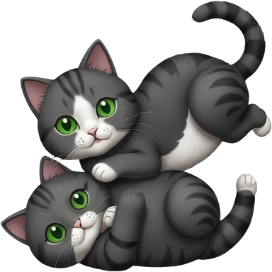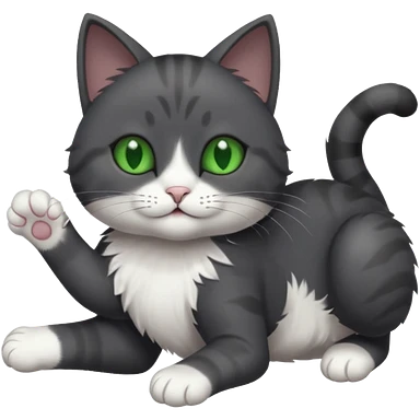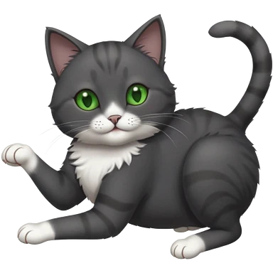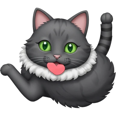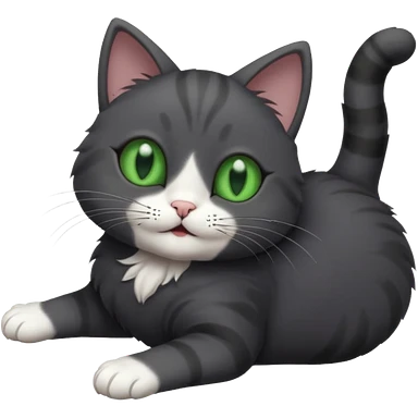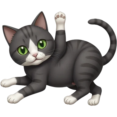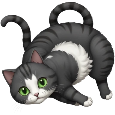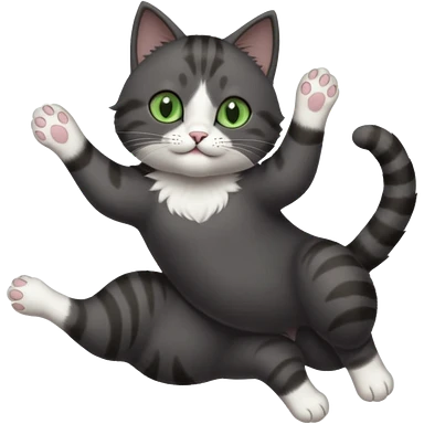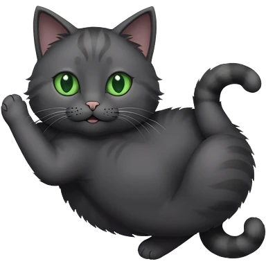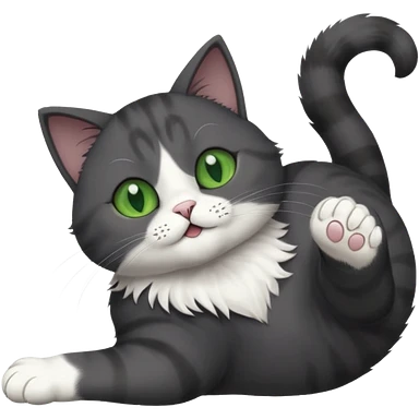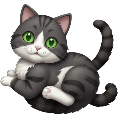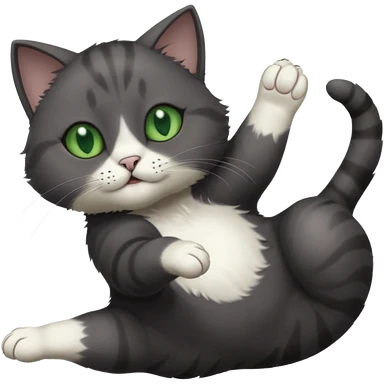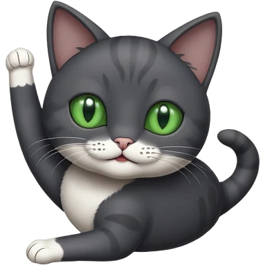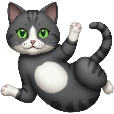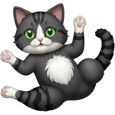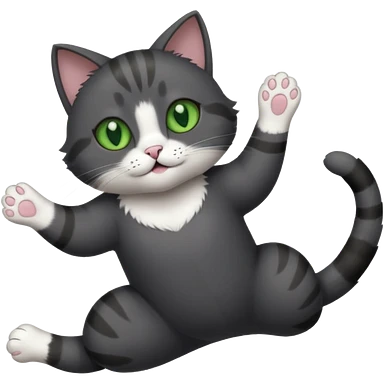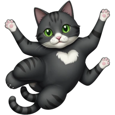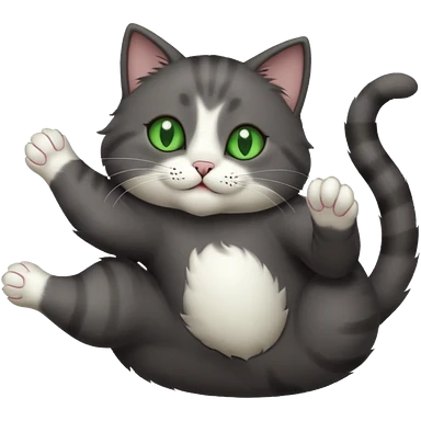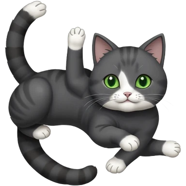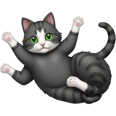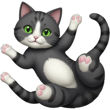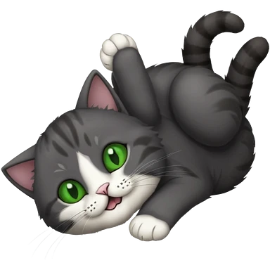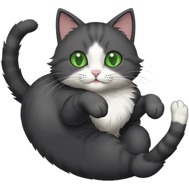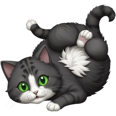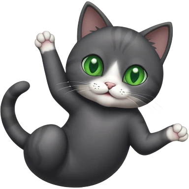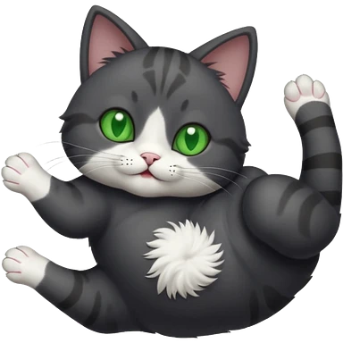 solid dark grey cat with green eyes, white toes/paws and white patch on her chest playfully rolling upside down emoji | AI Emoji Generator
