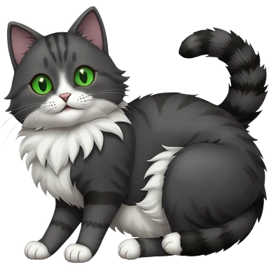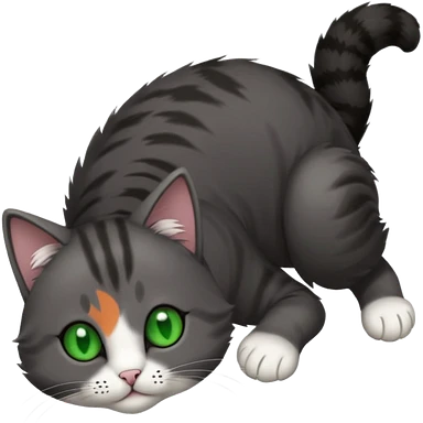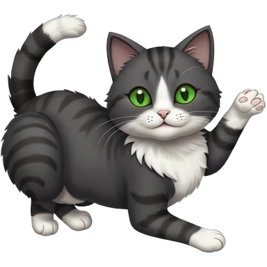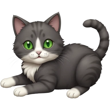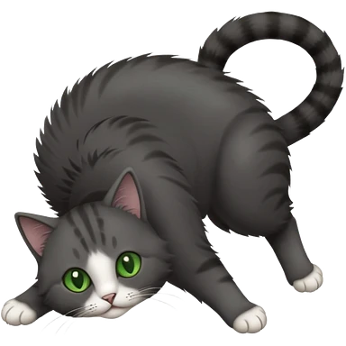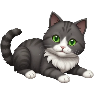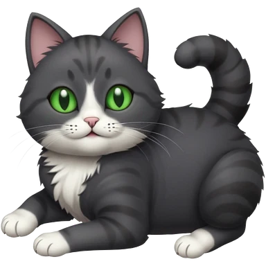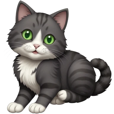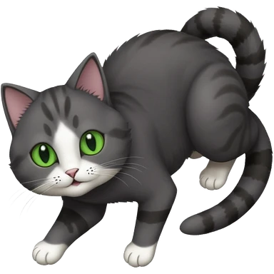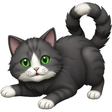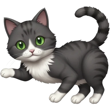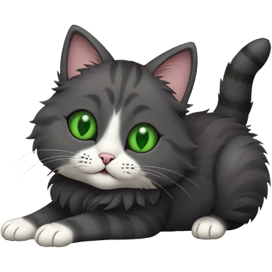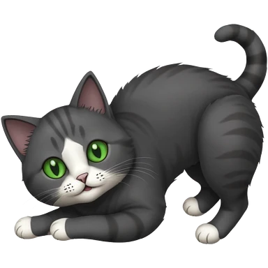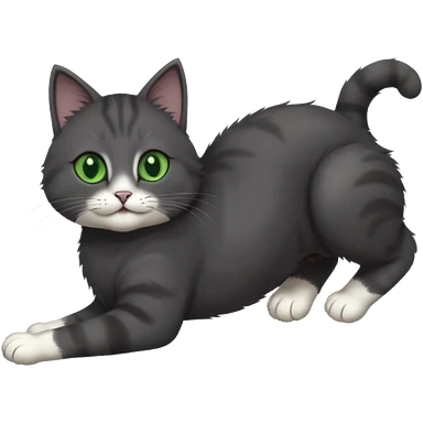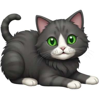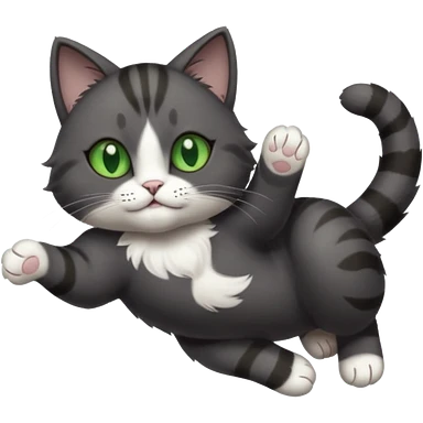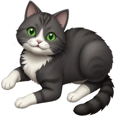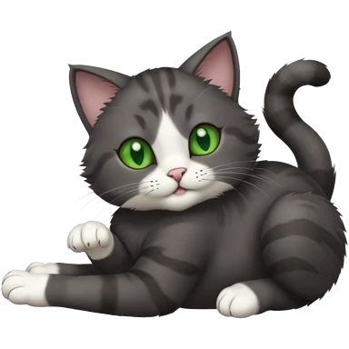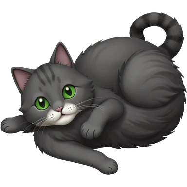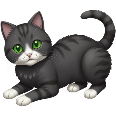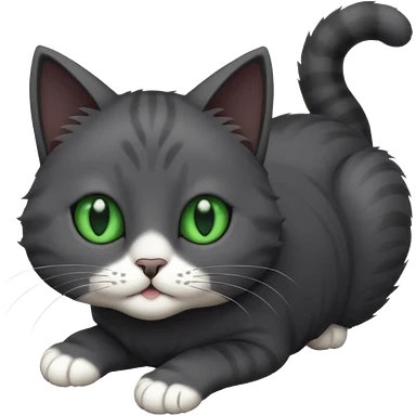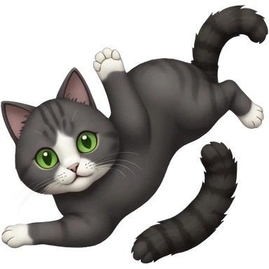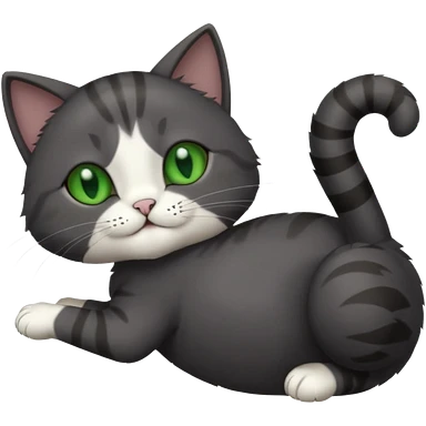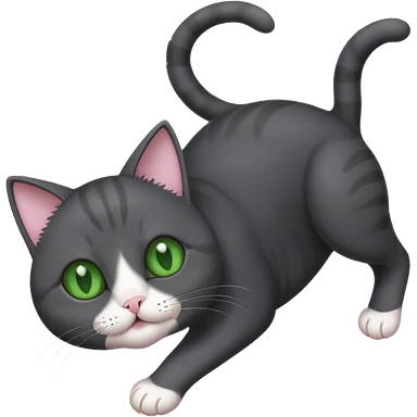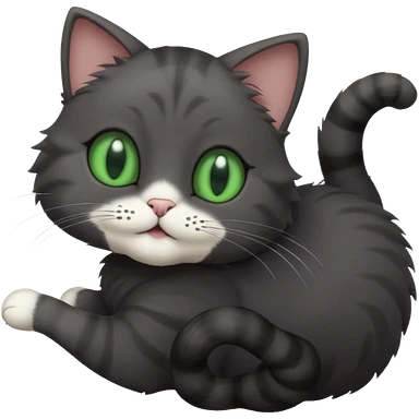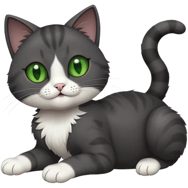 solid dark grey cat with green eyes, white toes/paws and white patch on her chest playfully rolling upside down emoji | AI Emoji Generator