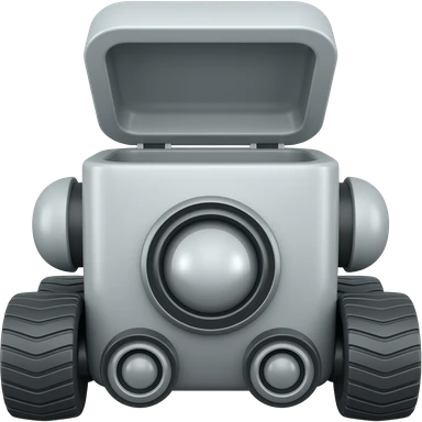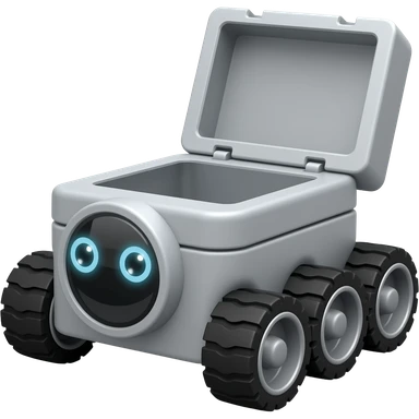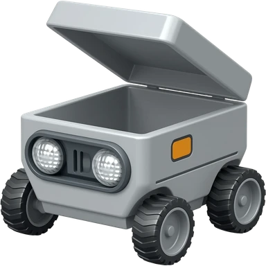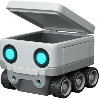 Solid rectangle gray delivery robot with circle white led eyes and opening lid on 4 wheels with food minimalistic design emoji | AI Emoji Generator
