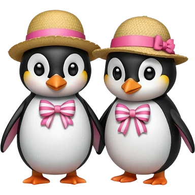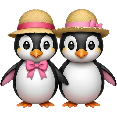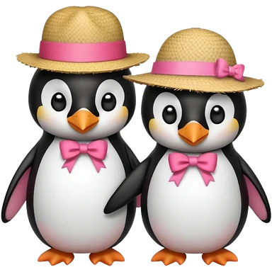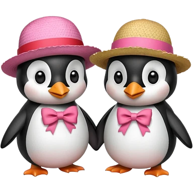 Allora fammi un emoji che rappresenta un pinguino con in testa un fiocco rosa che da la mano a un altro pinguino che in testa ha un cappello di paglia con al centro del cappello una striscia rossa emoji