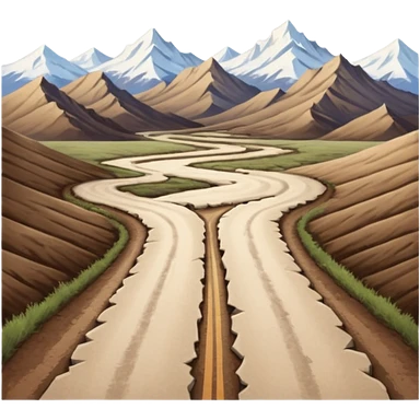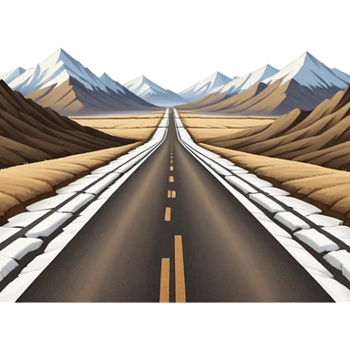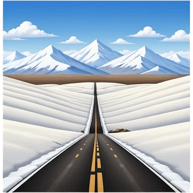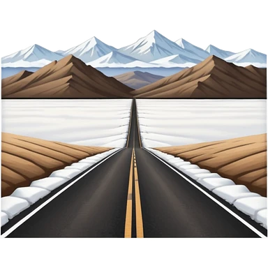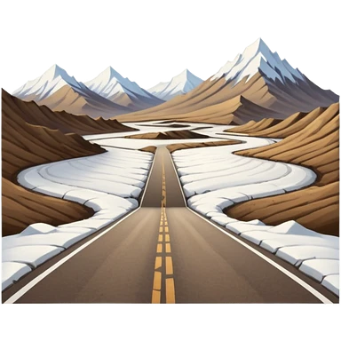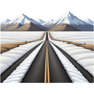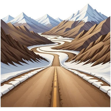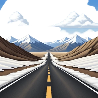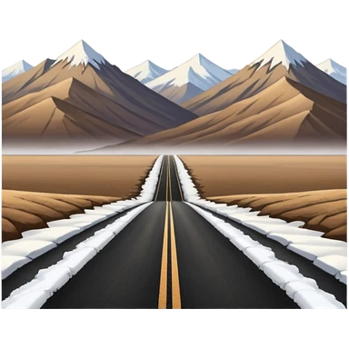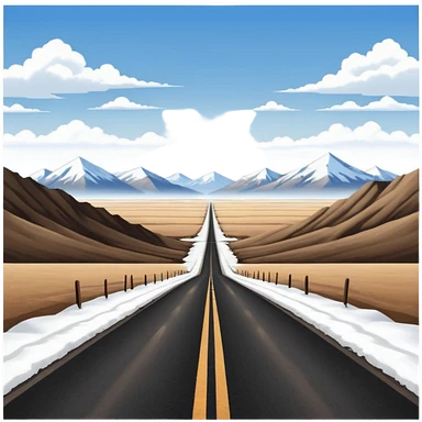 A long straight dirt road that disappears into the horizon half way up the screen from the perspective of someone sitting in the middle of the road looking down it. Flat snow fields on both sides of the road with huge looming mountains above the roads horizon line. emoji